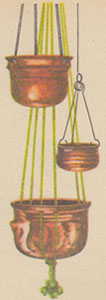 Техника вязания узлов несложна. Если освоить два-три основных узла и несколько видов цепочек, то, комбинируя их, можно «сочинить» и простые узоры, и сложные композиции. Для плетения подходят леньковые, льняные, джутовые веревки, простые и шелковые шнуры, шпагат, сутаж, рыболовная леска (кордовая и капроновая), толстые упругие шерстяные или синтетические нитки, проволока. Первые наборные узлы накидывают на натянутую и укрепленную горизонтальную веревку, проволоку или деревянную рейку, которую называют несущей. Затем нарезают рабочие нити. Каждую из них складывают пополам и затягивают обычной петлей на несущей. Закрепив таким образом нужное количество нитей, приступают к плетению. Длина рабочих концов должна быть примерно в четыре раза больше задуманной вещи. Для выполнения наиболее распространенного — плоского узла нужны две веревки, закрепленные на несущей, то есть, четыре рабочих конца. Два средних служат опорой при плетении, а крайними работают. Левый конец, согнутый под прямым углом, накладывают поверх средних опорных, правый идет сверху него, сгибается и протягивается под опорными концами. Потянув за рабочие концы, узел затягивают. Если вязать этим узлом цепочку, то она будет скручиваться красивой спиралью. Несильно затянутые узлы образуют ажурную цепь. Можно поочередно начинать вязку то левым, то правым концом, и тогда получатся двойные плоские узлы. Из них также делают различные цепи, а если плести их в шахматном порядке, то образуется сетка. Меняя расстояния между узлами, ее делают с крупными или мелкими ячейками. Чтобы подвесить горшок или кашпо, удобно обвязать пластмассовое, деревянное или проволочное кольцо, на которое встанет дно. Продолжив вязку, вы получите сетку, оплетающую стены горшка. Концы веревок связывают в большую кисть. Чтобы добиться успешного выполнения узлов, надо всегда держать натянутыми средние — опорные нити. В подвесных кашпо благодаря большому доступу света и воздуха цветы разрастаются очень пышно, если только вовремя поливать и подкармливать их. Эффектны подвесные цветники и в саду. Для этого высадите в горшки летники — петунию, настурцию, лобелию, бегонию со свисающими побегами или низкие яркие бархатцы, вербену. Можно вынести на лето из дому герань, кактусы, хлорофитум. Цепи и плетенки для улицы, конечно, лучше сделать из более прочного материала — толстой капроновой нити, проволоки, пластмассового провода. Весной сад, крыльцо, веранда будут выглядеть особенно нарядно с заранее выращенными под пленкой или в парнике анютиными глазками, маргаритками, гиацинтами. Растения осторожно пересаживают уже с бутонами или в цвету. Помните, что в вазонах, так же как и в других небольших емкостях, земля пересыхает быстрее, чем на клумбе, поэтому поливать надо чаще. Очень декоративны изделия из макраме в сочетании с древесными наростами — налами, грибами-трутовиками.